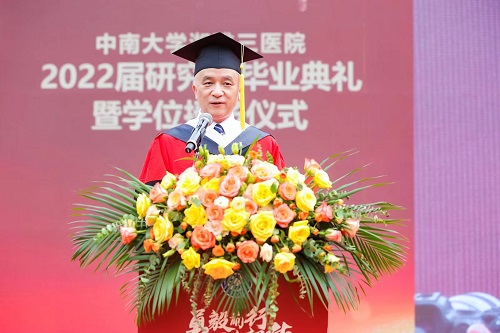 在热烈的掌声中,张国刚院长发表讲话,他对同学们在湘雅三医院求学期间不懈努力和所取得的成绩表示肯定和祝贺,并寄语全体毕业生:一要坚守初心,高擎理想之灯,二要牢记使命,终身学习成长;三要奋发有为,勇担医者使命。