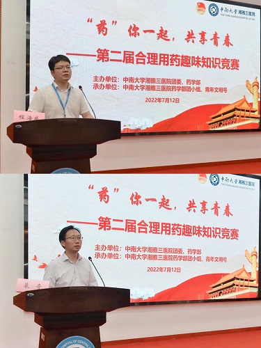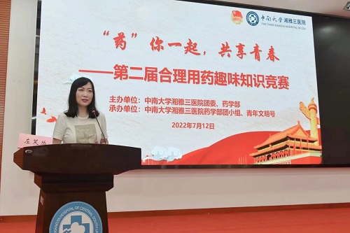 为进一步提升中南大学湘雅三医院的合理用药水平,营造积极向上的学习氛围,保障患者用药安全,7月12日晚,由院团委与药学部主办,药学部团小组、青年文明号承办的“‘药’你一起,共享青春”——2022中南大学湘雅三医院第二届合理用药趣味知识竞赛活动在外科楼二楼学术报告厅成功举行。院团委书记程海威、医务部副主任张晓伟、护理部副主任谢建飞,药学部党支部书记和副书记、药学部和药学教研室主任和副主任等出席此次活动。活动由青年药师尹文俊主持。