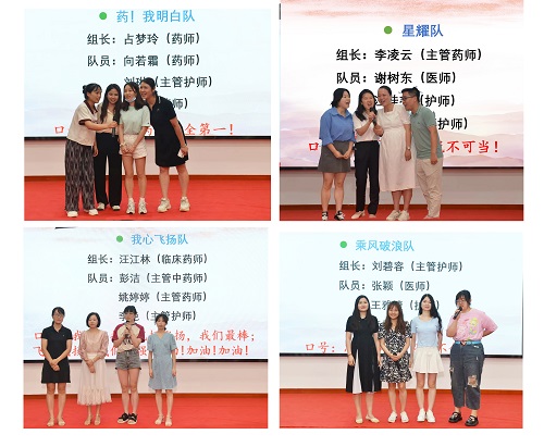 经过激烈的角逐和紧张的比拼,最终由来自药学部的主管药师李凌云、移植外科医师谢树东、19病区护师汪桂芬、35病区主管护师周玲组成的星耀队夺得此次比赛的一等奖;来自药学部的临床药师汪江林,主管中药师彭洁、主管药师姚婷婷、内科ICU主管护师李艳组成的我心飞扬队获得二等奖;由41病区主管护师刘碧蓉、护师王雅婕、护士李佳嵘、移植外科医师张颖组成的乘风破浪队和药学部药师占梦玲、药师向若霜、药师吴莹、主管护师刘琳组成的药我明白队并列获得比赛三等奖。颁奖环节,现场嘉宾和评委为获奖队伍一一颁奖并合影留念。