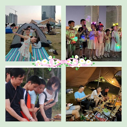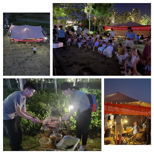 疫情以来,大家不仅工作紧张,生活和休闲上也备受各种限制,同事们、孩子们都难得相聚。在这个江风习习的夜晚,星星点点的彩灯装点起来的露营地上,空气中飘荡着丝丝缕缕烤肉的烟火气味,同事们围坐在摆满美食的桌前,也谈谈工作,也聊聊家常。小儿女们手牵着手嬉笑,撒开腿追逐,露天的动画片开始播放,大大小小的“葫芦娃们”立马规规矩矩排排坐。秋风声自远,露天的KTV别有一番风味,幼儿园组的《孤勇者》,老院长堪称专业级的《来生缘》,无不精彩绝伦。