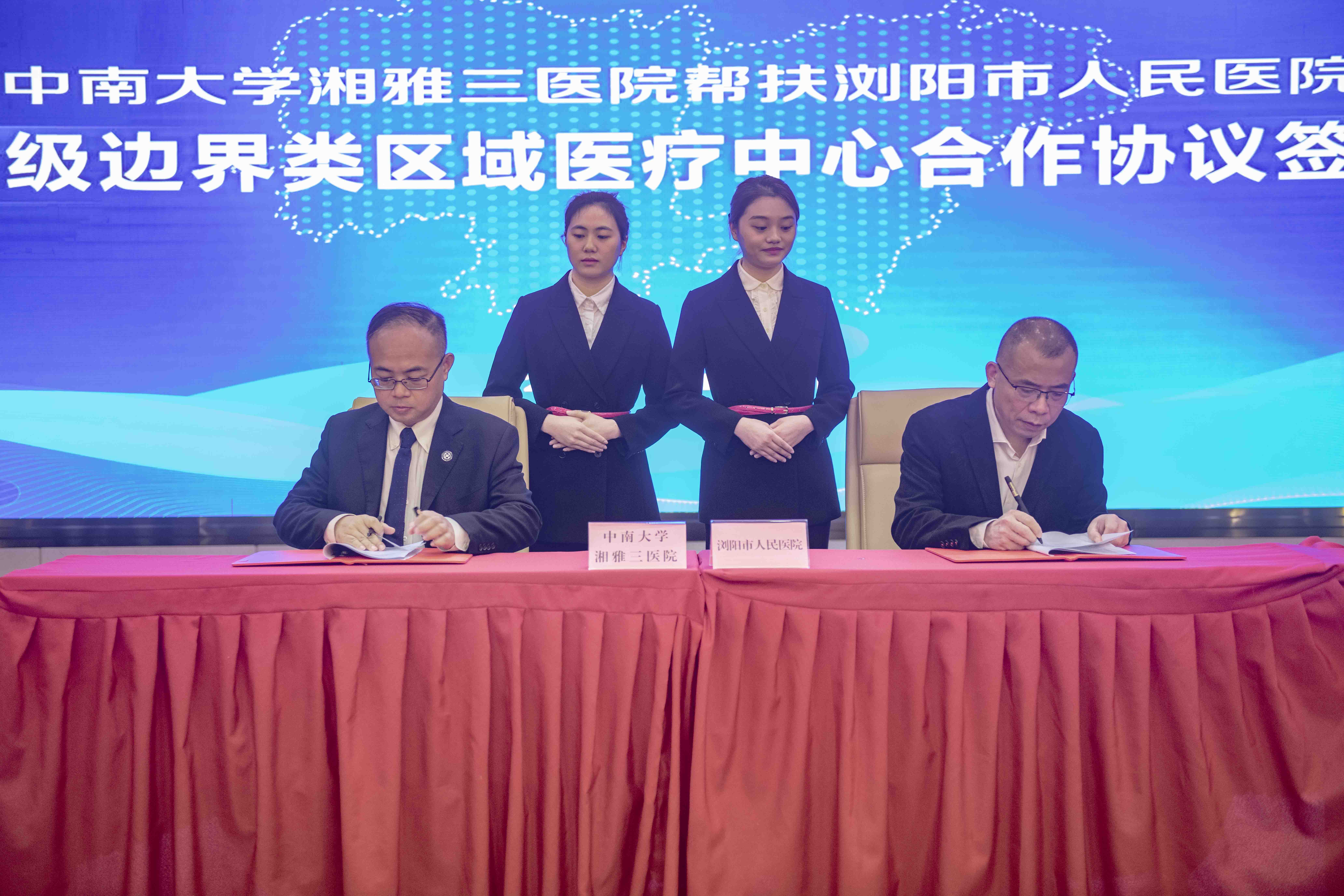 会议现场,中南大学湘雅三医院院长江泓与浏阳市人民医院党委书记张勇,共同签署了中南大学湘雅三医院帮扶浏阳市人民医院建设省级边界类区域医疗中心的合作协议。