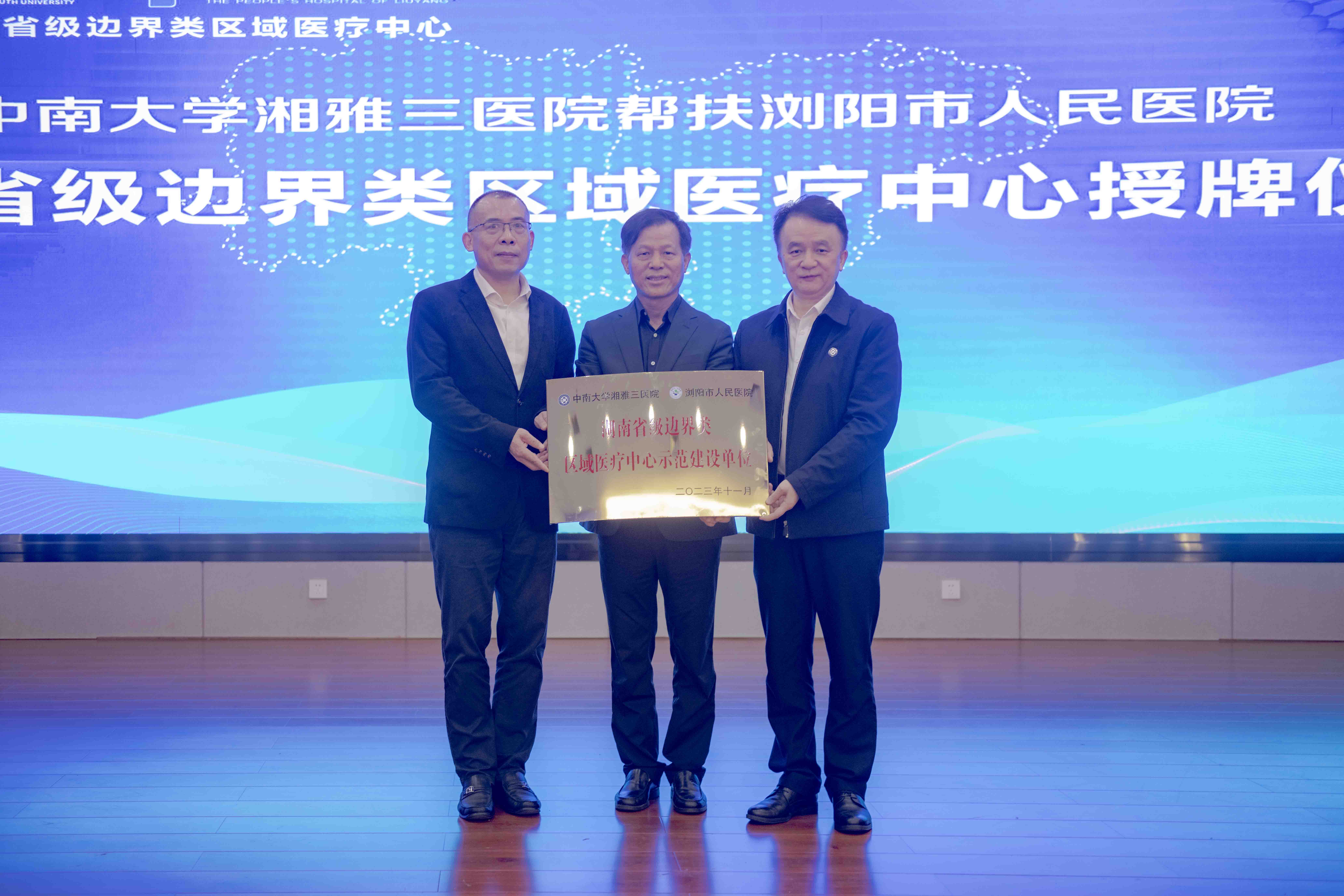 随后,湖南省卫生健康委副主任祝益民向中南大学湘雅三医院和浏阳市人民医院授予湖南省级边界类区域医疗中心示范建设单位牌匾。
