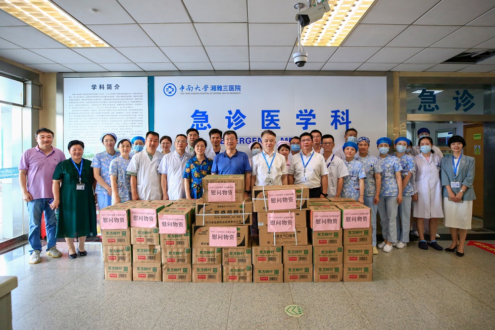 接着,刘湘凌主席一行受邀参加了湘雅三医院工会组织的“送清凉”慰问活动,先后赴门诊楼、急诊楼看望、慰问奋战在一线为患者健康保驾护航的医务工作人员。每到一处,慰问组都与一线医务人员亲切交谈,了解大家的工作生活情况,向不畏高温、坚守岗位,奋战在临床一线的医务人员致以亲切的问候和温暖的关怀,并为他们送上藿香正气液、夏桑菊、东方树叶茶饮等清凉慰问物资。何庆南书记特意嘱咐大家炎炎夏日,面临高温“烤”验,要合理安排工作,注重岗位安全,为患者提供优质医疗服务的同时,也要注意自己的身体健康。