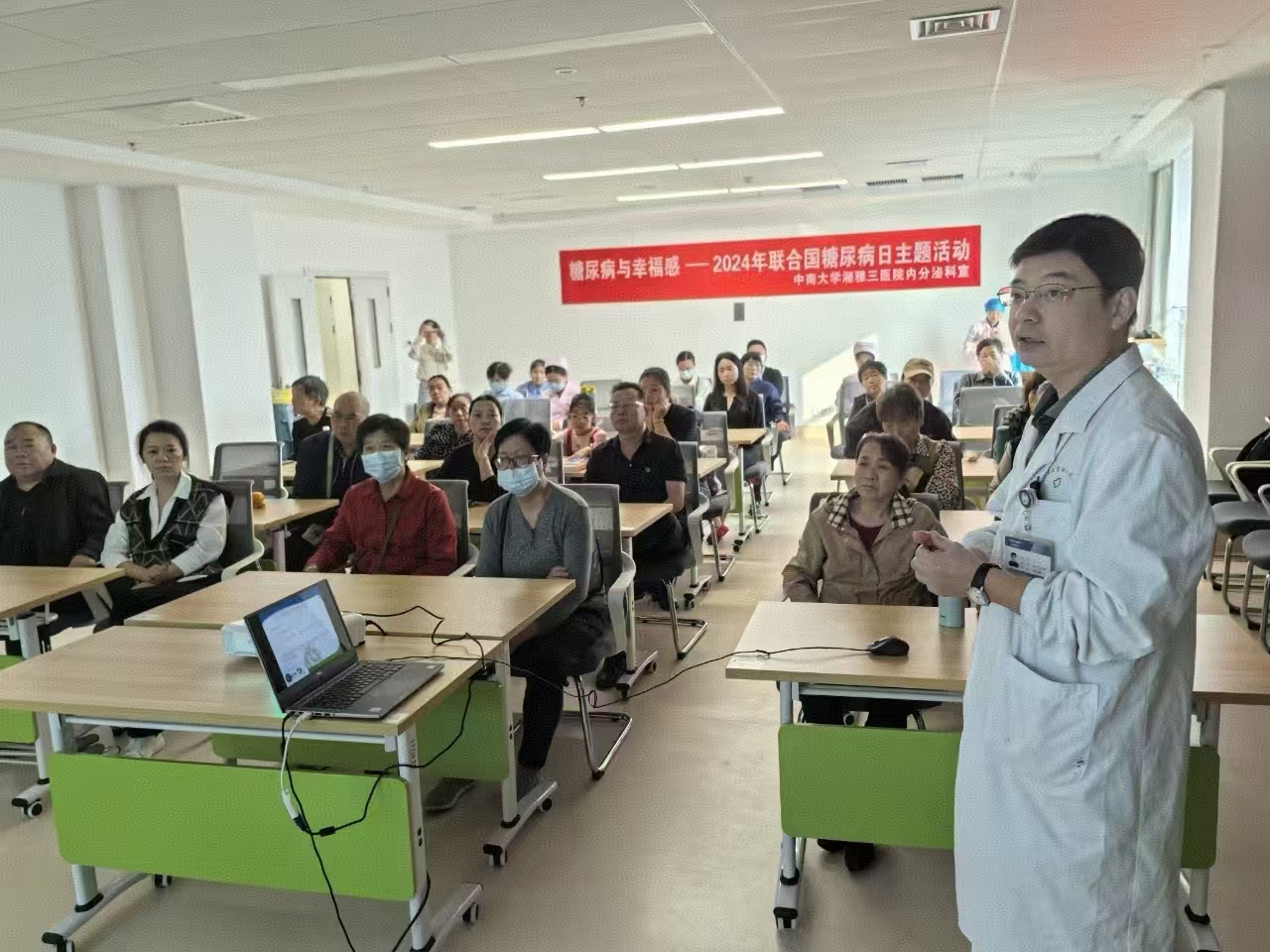 2024年11月14日是第18个联合国糖尿病日,今年的主题是“糖尿病与幸福感”。14日上午,中南大学湘雅三医院内分泌科在新湘雅门诊健康讲堂举办了一场科普宣教活动。此次活动旨在增进公众对糖尿病的认识,提高糖尿病患者的生活质量和幸福感。