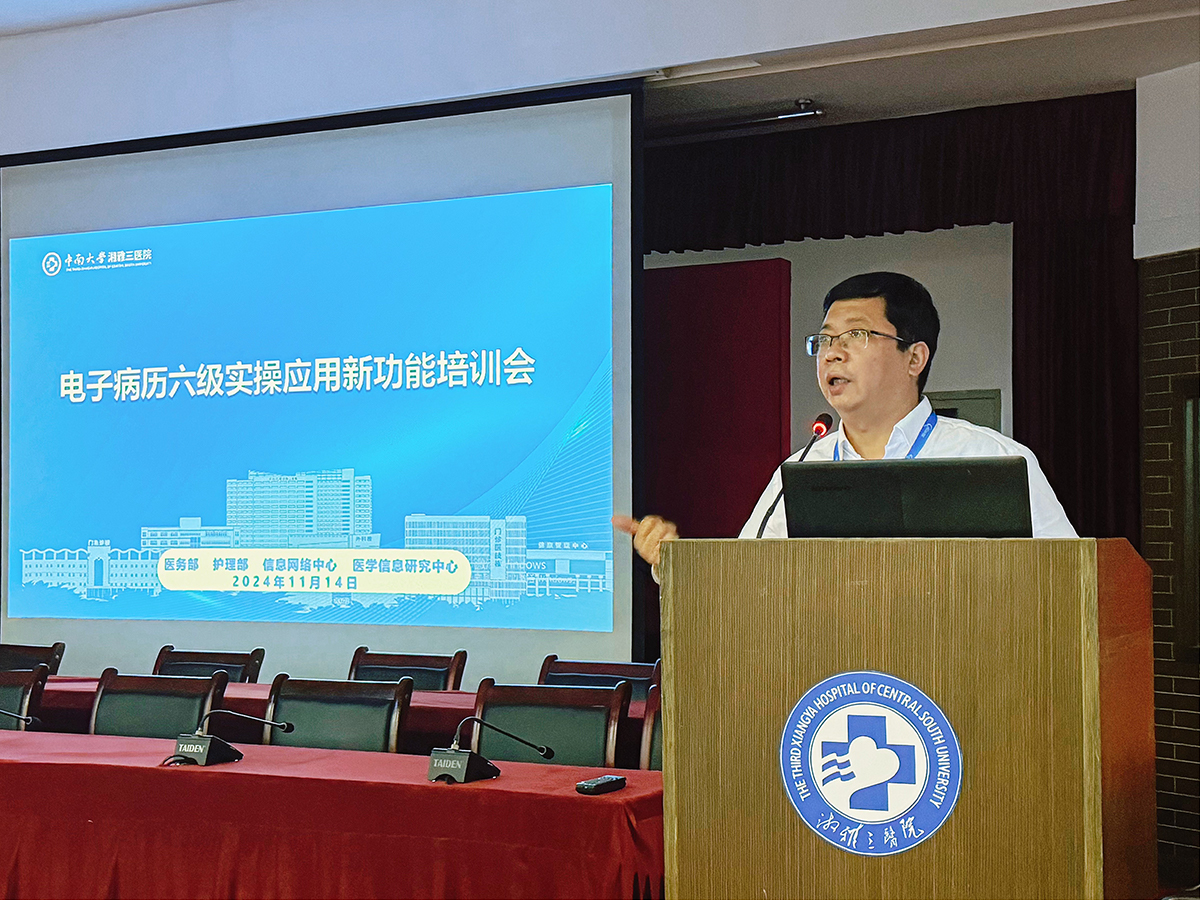 11月14日下午四时,中南大学湘雅三医院在急诊楼五楼会议室召开电子病历六级实操应用新功能培训会。湘雅三医院院长江泓出席并做重要指示,全院护士长、总住院及各科室信息第一责任人近150余人参会。培训会由党委副书记杨飞龙主持。