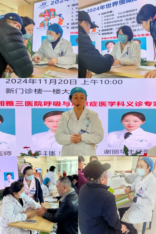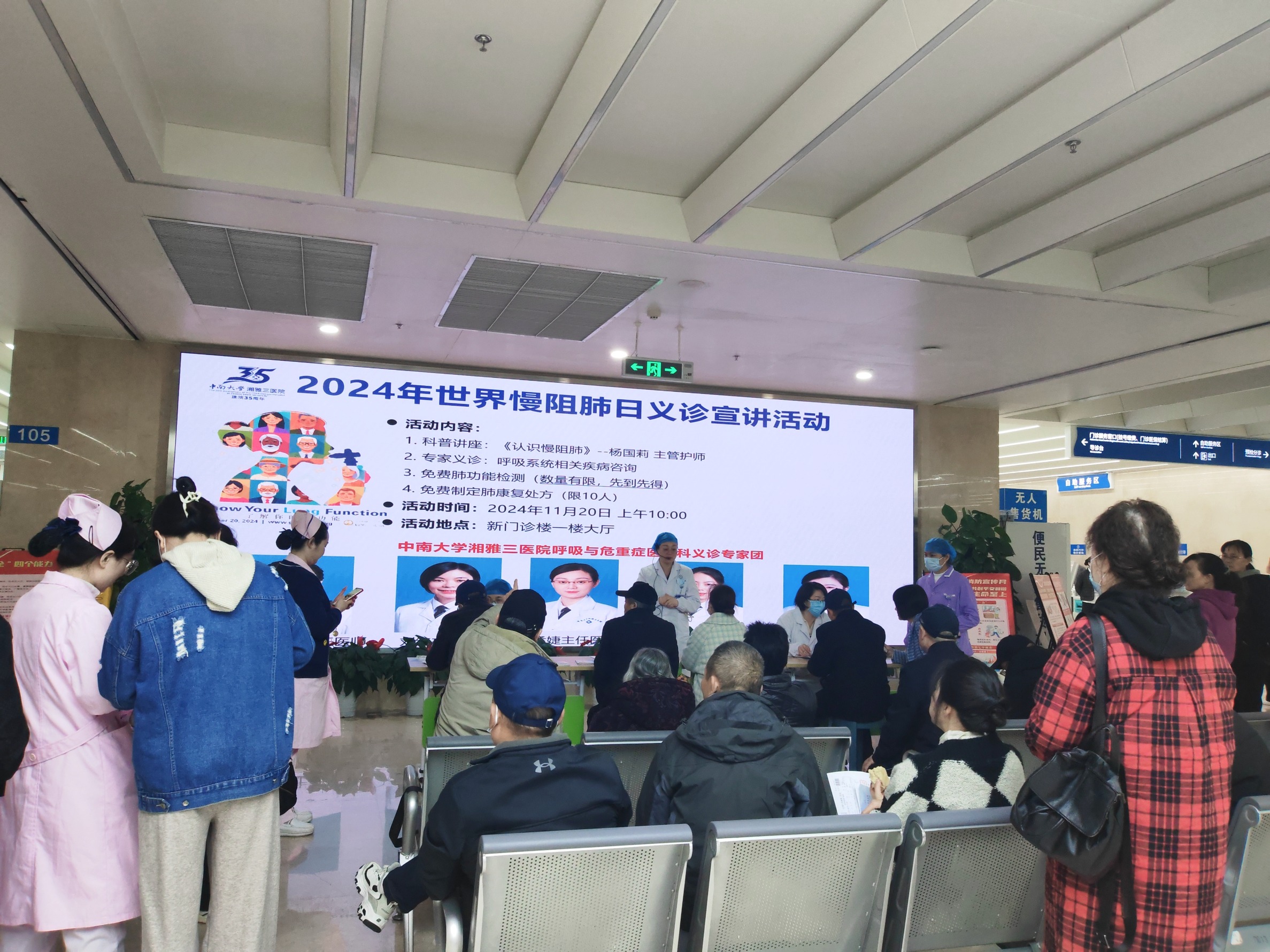 2024年11月20日是第23个世界“慢阻肺日”,今年的主题是“认识你的肺功能”。为提高人民群众对该疾病的知晓率、促进早诊、早治,湘雅三医院呼吸与危重症医学科主任孟婕、副主任刘纯、副主任谢丽华、护士长杨阳、内科ICU护士长唐迎际带领科室医护人员于上午10点在医院门诊楼一楼大厅开展义诊宣讲活动。