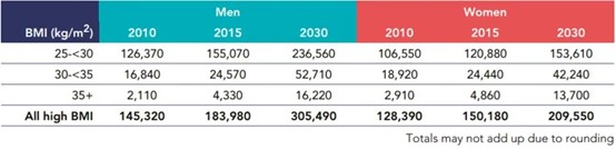 表2010年、2015年和2030年(预估)中国高BMI成年人口数量(单位:千)
