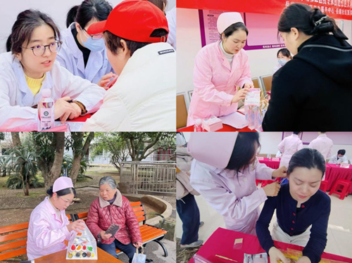 乳甲外科医护在给居民做健康指导和耳穴压豆服务