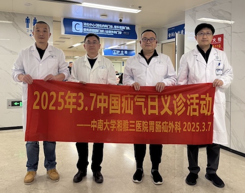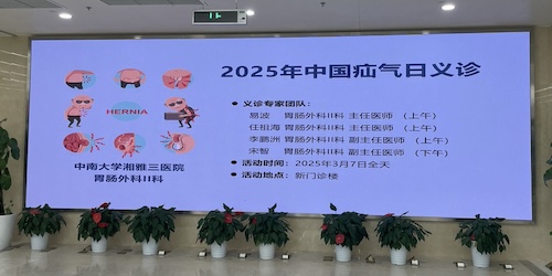 3月7日,中南大学湘雅三医院胃肠外科Ⅱ科在医院门诊楼开展“中国疝气日”义诊活动。胃肠外科Ⅱ科朱利勇主任医师、易波主任医师,以及任祖海主任医师、李鹏洲副主任医师以及宋智副主任医师等组成的专家团队在新门诊为患者提供健康查体、个性化治疗指导及术后康复答疑。活动累计接诊50余人次,发放科普手册百余份,通过一对一宣教帮助患者了解疝疾病的术前术后注意事项,优化就医流程。活动还为一名疝气嵌顿的七旬老人实施急诊手术。