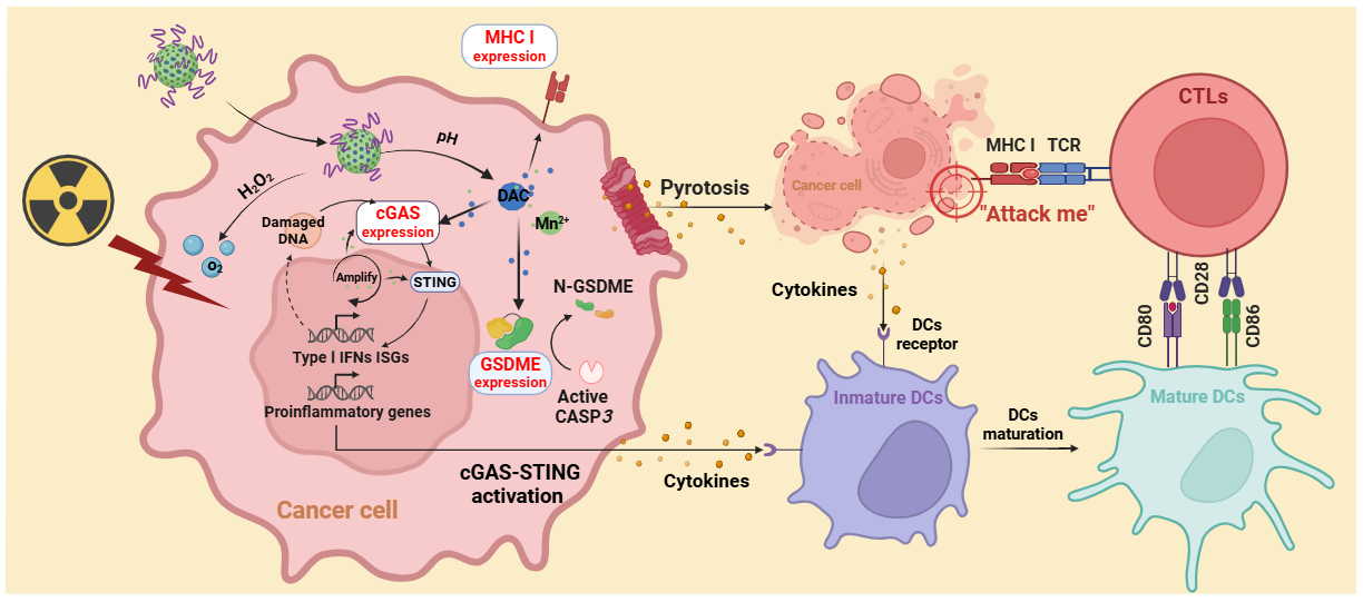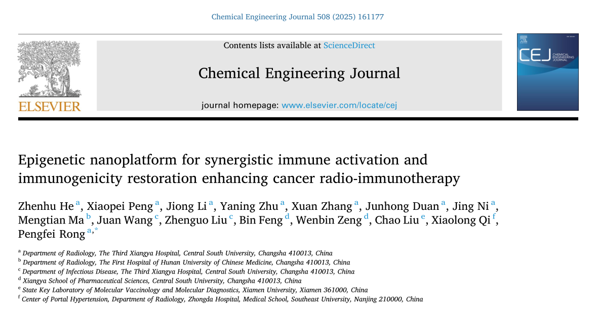 近日,中南大学湘雅三医院放射科容鹏飞教授团队在国际权威期刊《Chemical Engineering Journal》(化学工程杂志,中科院1区TOP期刊,IF = 13.4)以Research Article形式发表题为“Epigenetic nanoplatform for synergistic immune activation and immunogenicity restoration enhancing cancer radio-immunotherapy”(表观遗传学纳米平台协同免疫激活和免疫原性恢复增强癌症放射免疫治疗)的原创研究论文。容鹏飞教授为独立通讯作者,何真虎博士为独立第一作者,中南大学湘雅三医院放射科为论文第一及通讯作者单位。