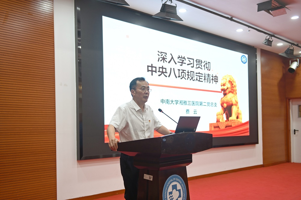 费云以“深入学习贯彻中央八项规定精神”为主题,向党员同志们讲授了中央八项规定的具体内容、中央八项规定精神的具体指向、习近平总书记相关重要论述以及如何把中央八项规定精神落到实处。他指出,中央八项规定精神是读懂新时代中国共产党的一把“钥匙”,更是新时代推进党的自我革命的制度成果。他强调,全体党员要把中央八项规定精神落到实处,需要高质量完成以下几个具体任务:一是开展学习研讨,二是对标对表查摆问题,三是列出整改清单进行集中整治,四是开门教育,开展调查研究,强调立足岗位作贡献。全体党员干部必须自觉将中央八项规定精神内化为指导医疗实践、提升政治素养,加强医德医风建设的强大思想武器,以高度的政治责任感推动医院各项工作迈上新台阶。