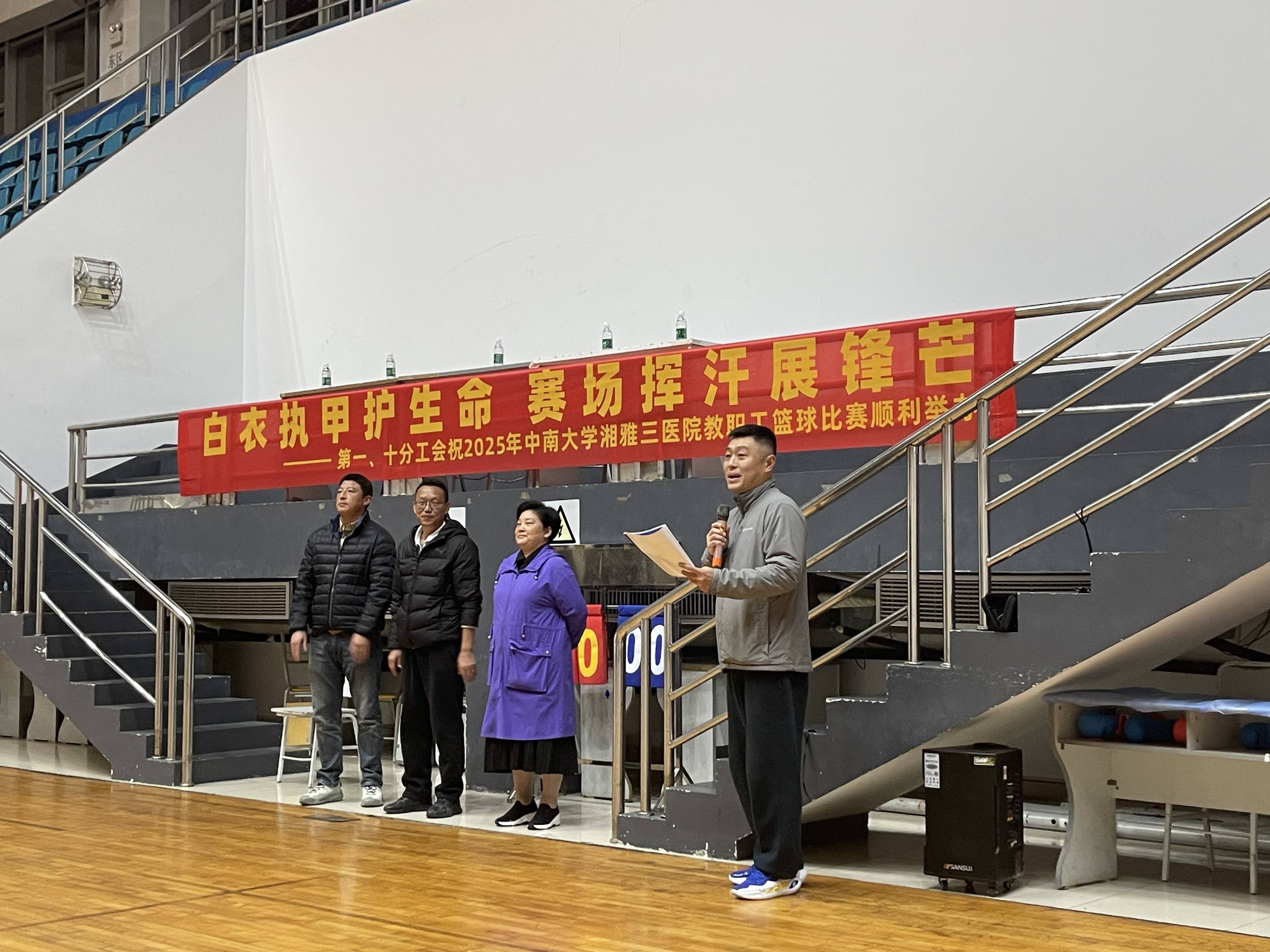 赛前,中南大学体育教研部副主任易国忠、中南大学体育教研部教学办公室主任刘强、中南大学湘雅三医院工会常务副主席熊晓云等出席了简短而热烈的开幕式。熊晓云在致辞中向全体参赛队伍和参赛队员表现出的饱满精神给予了高度的肯定。她指出,在医院处于“十四五”规划收官和“十五五”规划谋篇布局的关键时期,举办篮球赛的主要目的就是要积极引导医院职工学习贯彻落实习近平总书记关于人民健康的重要论述,全面践行“健康中国”战略,激励新湘雅教职工主动投身群众性健身活动,营造团结和谐、积极向上的工作与生活氛围,为新湘雅高质量发展奠定坚实健康基础。
