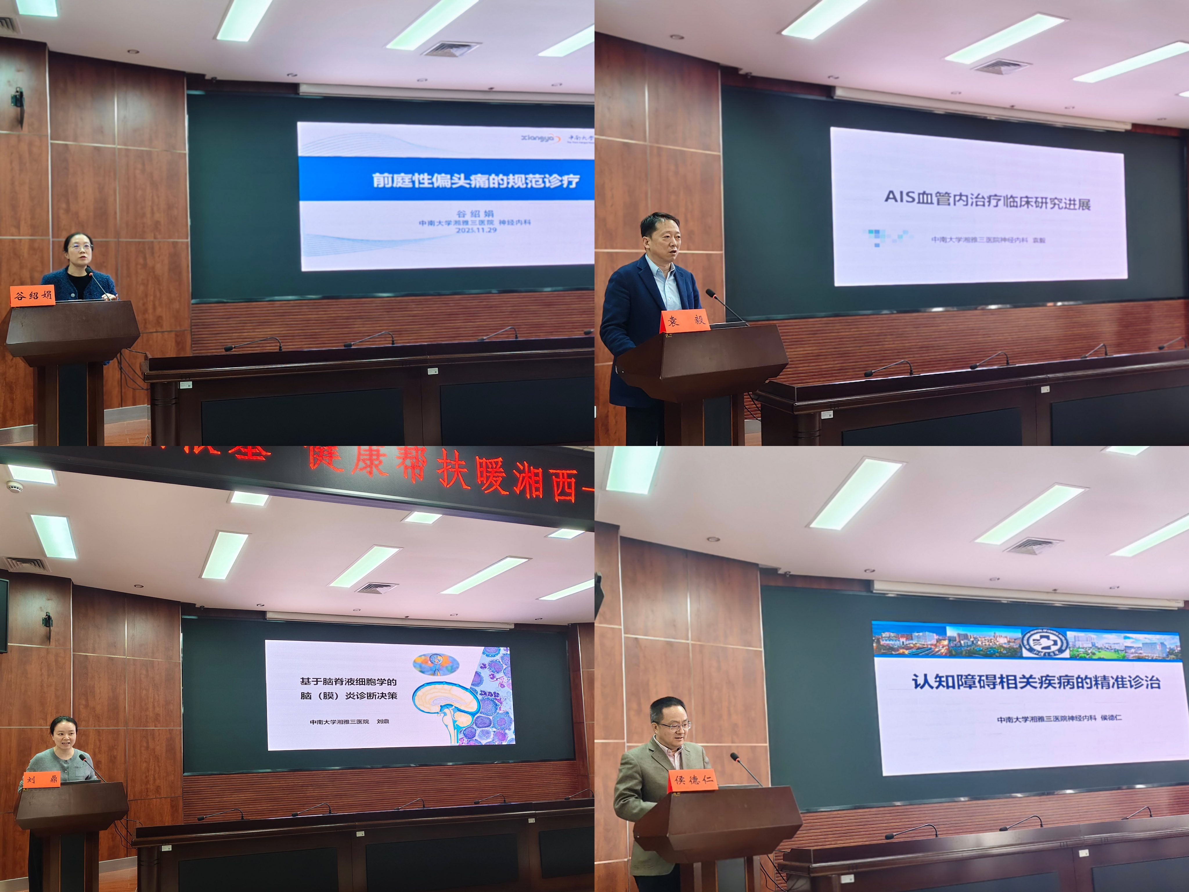 学术交流会由郑文副教授主持。湘西州人民医院贾浩副院长回顾了该院神经内科在湘雅三医院帮扶下取得的进展,对专家团队的到来表示感谢,并勉励湘西州同仁们认真学习交流,实现“大病不出县”医改目标。随后,侯德仁教授认真剖析和学习了《认知障碍的精准诊治》,袁毅教授分享了《缺血性脑卒中再灌注治疗新进展》,就目前卒中绿道的就诊救治和一线临床医生进行答疑解惑;刘鼎副教授和谷绍娟副教授分别从《脑脊液细胞学的临床诊断与决策》和《前庭性偏头痛的规范诊疗》结合临床病例进行专题解读。宋治教授指出本次活动始终坚守公益初心,聚焦基层实际需求,现场互动频繁,实现“专家下沉”与“问题上传”双向贯通,为基层医护人员创造更多学习机会,推动了区域医疗同质化发展。