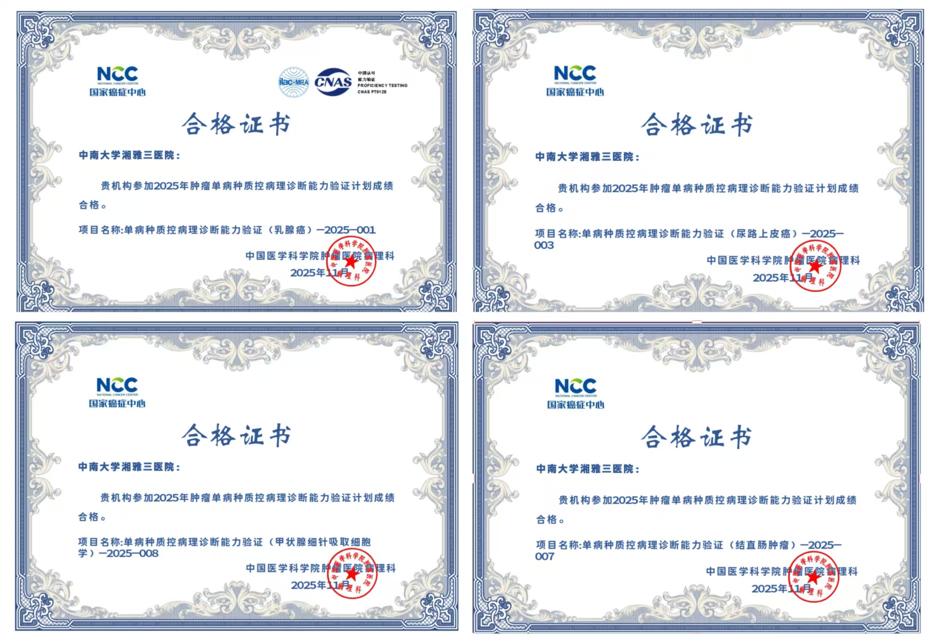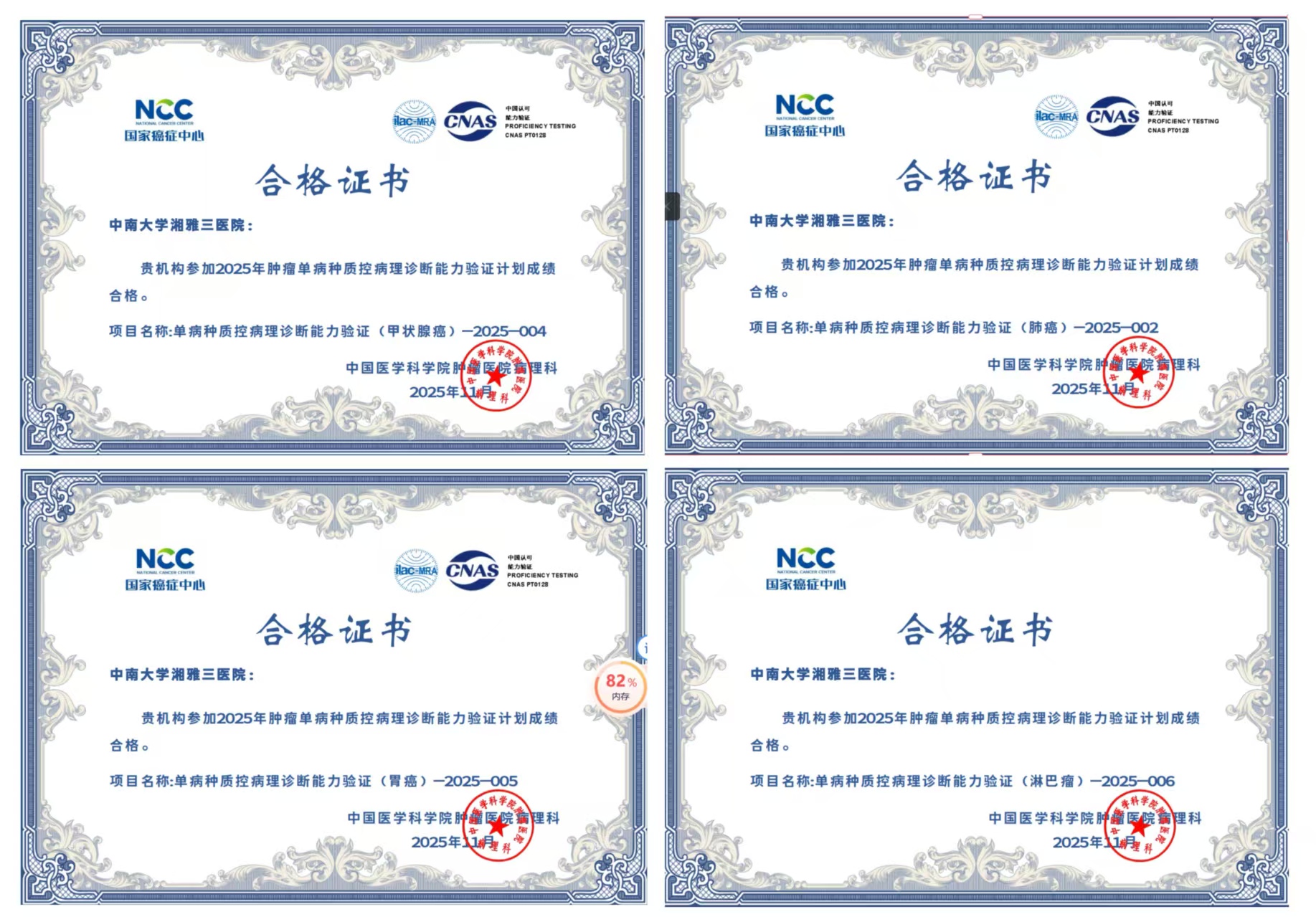 近日,从国家癌症中心传来捷报,中南大学湘雅三医院病理科在2025年度国家肿瘤单病种质量控制病理诊断能力验证中,凭借团队扎实过硬的病理诊断功底、规范的病理诊断流程,顺利通过全部验证项目,部分项目获得优秀评价。这一成绩不仅是对病理科诊断能力与质量管理体系的权威认可,更是对医院整体肿瘤诊疗规范化水平的有力印证,为保障患者获得同质化、高水准的诊疗服务奠定了坚实的病理基础。