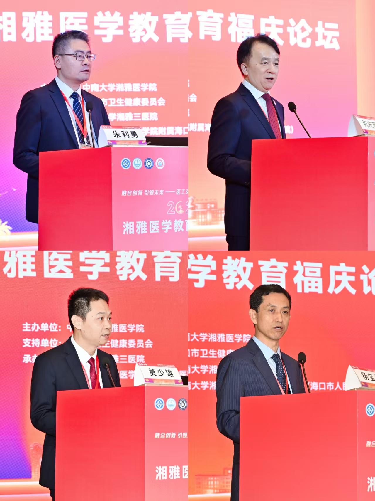 开幕式上,中南大学党委常委、副校长黎志宏,湘雅医学院党委书记朱利勇,湘雅三医院党委书记何庆南,湘雅医学院附属海口医院党委书记莫少雄致辞。他们围绕医工交叉、融合育人的核心主题,分别从学校战略、学科破壁、发展方向、区域使命等角度,阐释了新时代医学教育创新的方向与路径,体现了湘雅体系协同发力、服务“健康中国”的共同担当。开幕式由湘雅医学院附属海口医院院长杨宝贵主持。