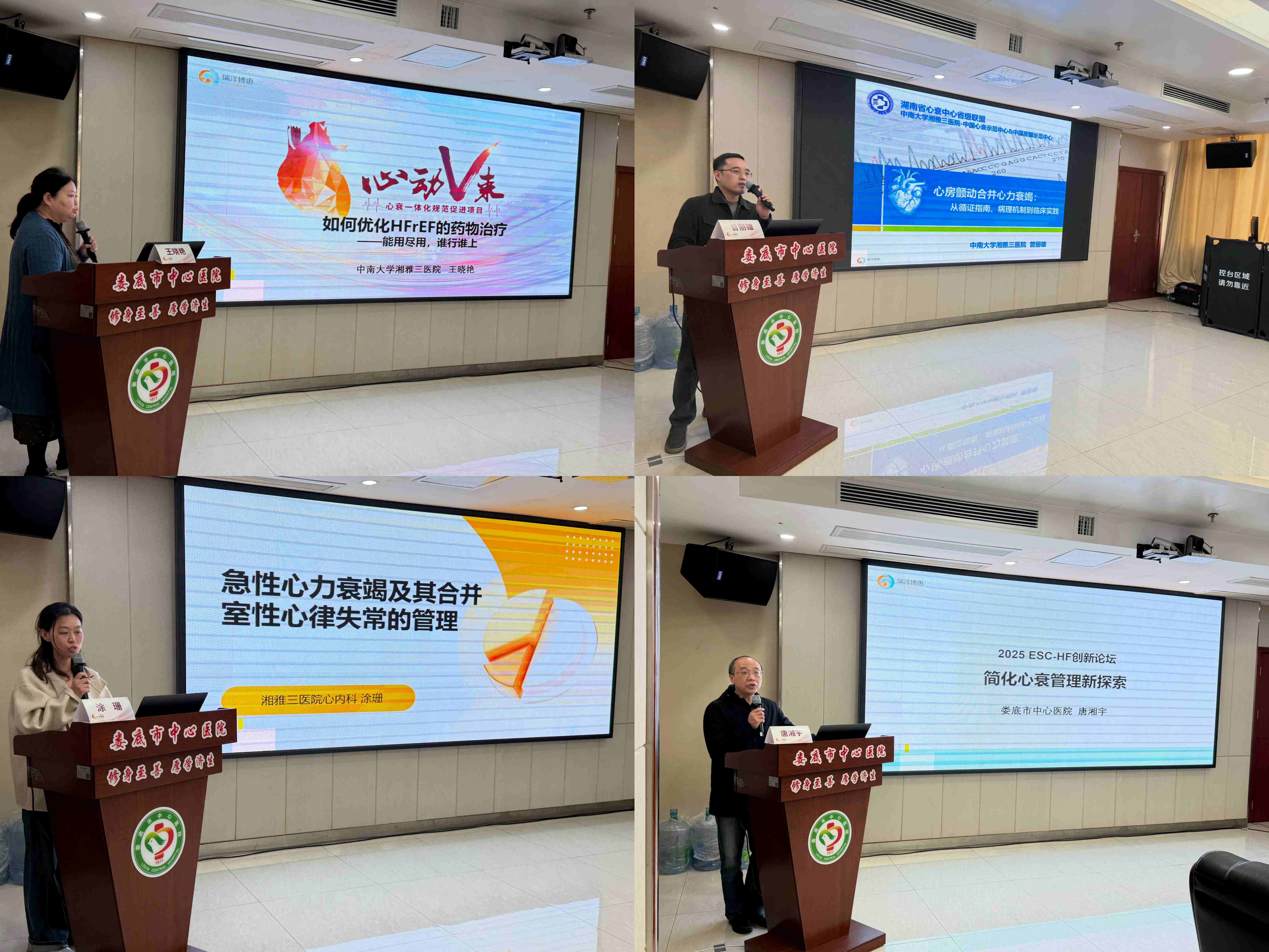 学术专题环节中,张志辉教授团队成员王晓艳、曾丽雄、涂珊分别围绕《心衰中心的建设进展意义及认证流程》《如何优化HFrEF的药物治疗》《心衰合并房颤的共管共治》《急性心力衰竭及其合并室性心律失常的管理》等主题,从多角度对心衰中心建设与心力衰竭相关知识进行了深入解读。随后,娄底市中心医院唐湘宇教授就《2025ESC-HF创新论坛:简化心衰管理新探索VELOCITY研究解读》作了专题分享。