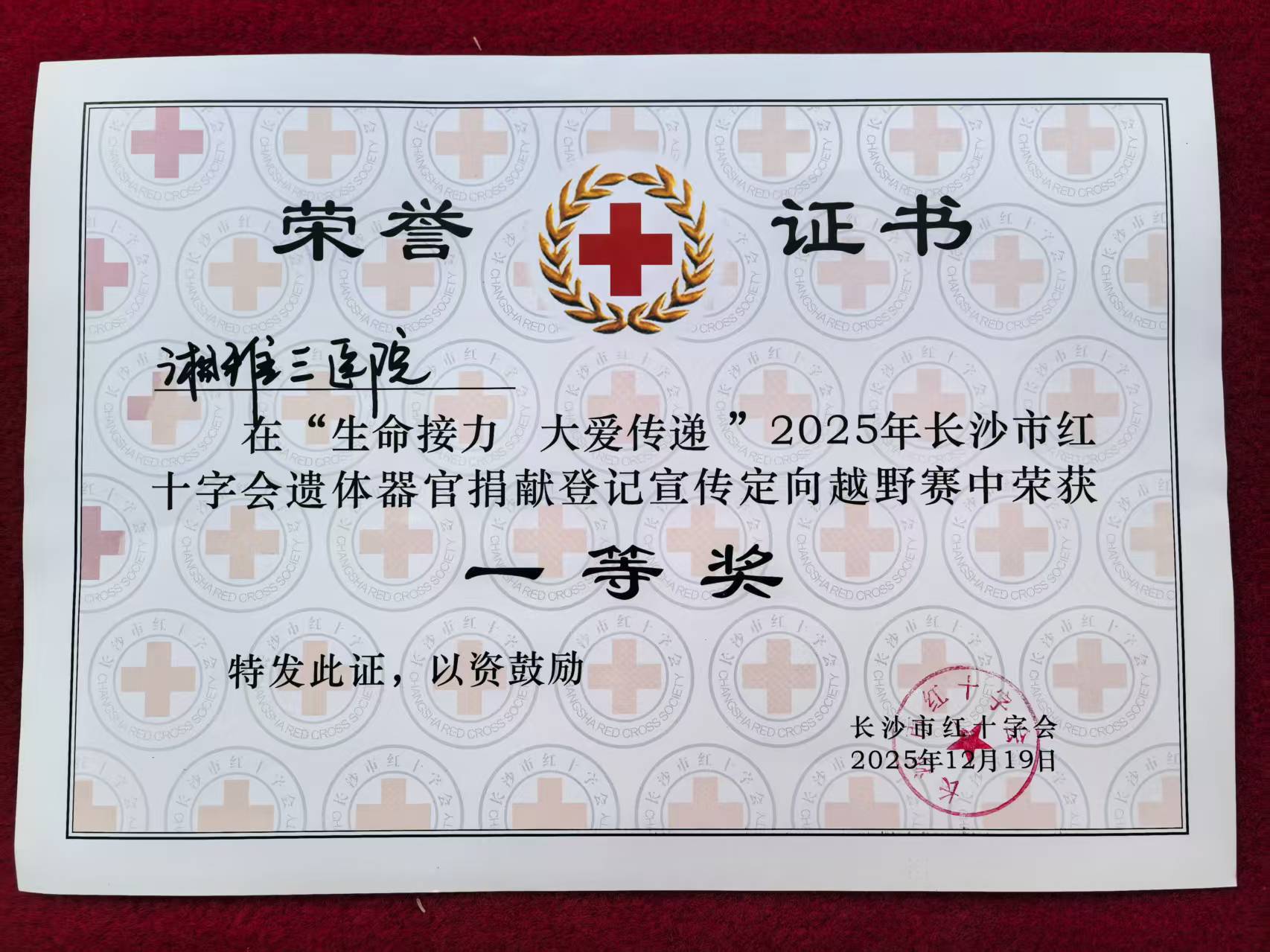 12月19日,在由市红十字会及市卫健委主办的“生命接力·大爱传递”——器官捐献宣传公益越野赛中,中南大学湘雅三医院选派的代表队凭借出色的团队协作、扎实的科普宣传和顽强的拼搏精神,在全市五十余家医疗机构及公益团队中脱颖而出,以绝对优势荣获赛事第一名。
