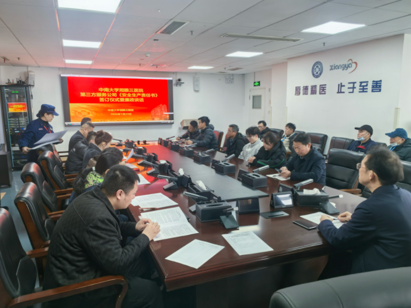 2026年1月23日上午,医院安全生产委员会办公室在外科楼十九楼会议室组织第三方服务公司《安全生产责任书》签订仪式暨廉政谈话活动。医院党委副书记、纪委书记张劲强,党委委员、副院长欧阳文出席仪式活动并讲话。安全保卫部、后勤保障部、基建办、物流配送中心、药学部负责人以及来自保安、物业、消防、餐饮、工程建设、医疗配送等19家第三方服务公司的负责人或代表共同参活动。该仪式活动由安全保卫部主任兼医院安全生产委员会办公室主任严文广主持。