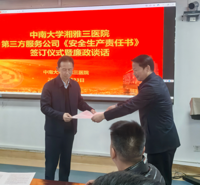 此次签订仪式是湘雅三医院深化安全生产与廉政管理的重要举措,不仅进一步压实了第三方服务公司的安全生产责任,筑牢医院安全防线,也明确了廉洁合作的行为准则,为构建长期稳定、安全互信的战略合作伙伴关系奠定了坚实基础。