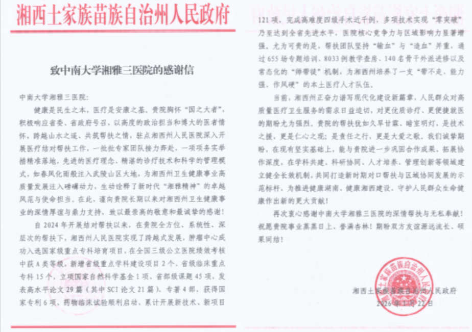 高湘文代表湘西州人民政府宣读了《致中南大学湘雅三医院的感谢信》。他表示,湘雅三医院以高度的政治责任和深厚的医者情怀,为湘西州卫生健康事业注入了强劲动力,生动诠释了新时代“新湘雅精神”。他强调,当前湘西州正全面推进现代化建设,人民群众对优质医疗资源的需求日益增长,希望双方进一步拓展合作深度,在学科共建、科研协同、人才培养、管理提升等方面建立健全长效机制,共同打造全省乃至全国对口帮扶与区域协同发展的示范标杆。