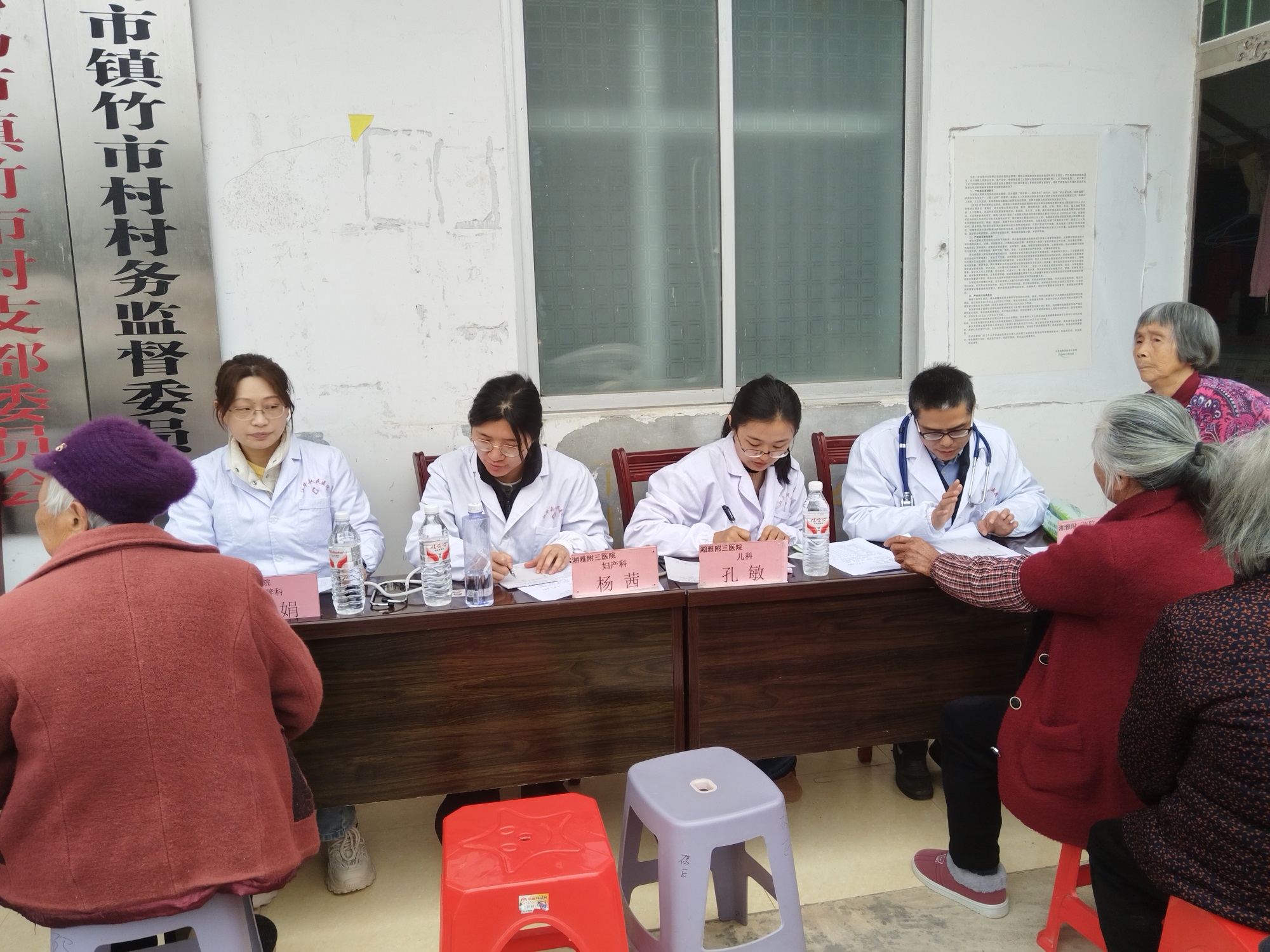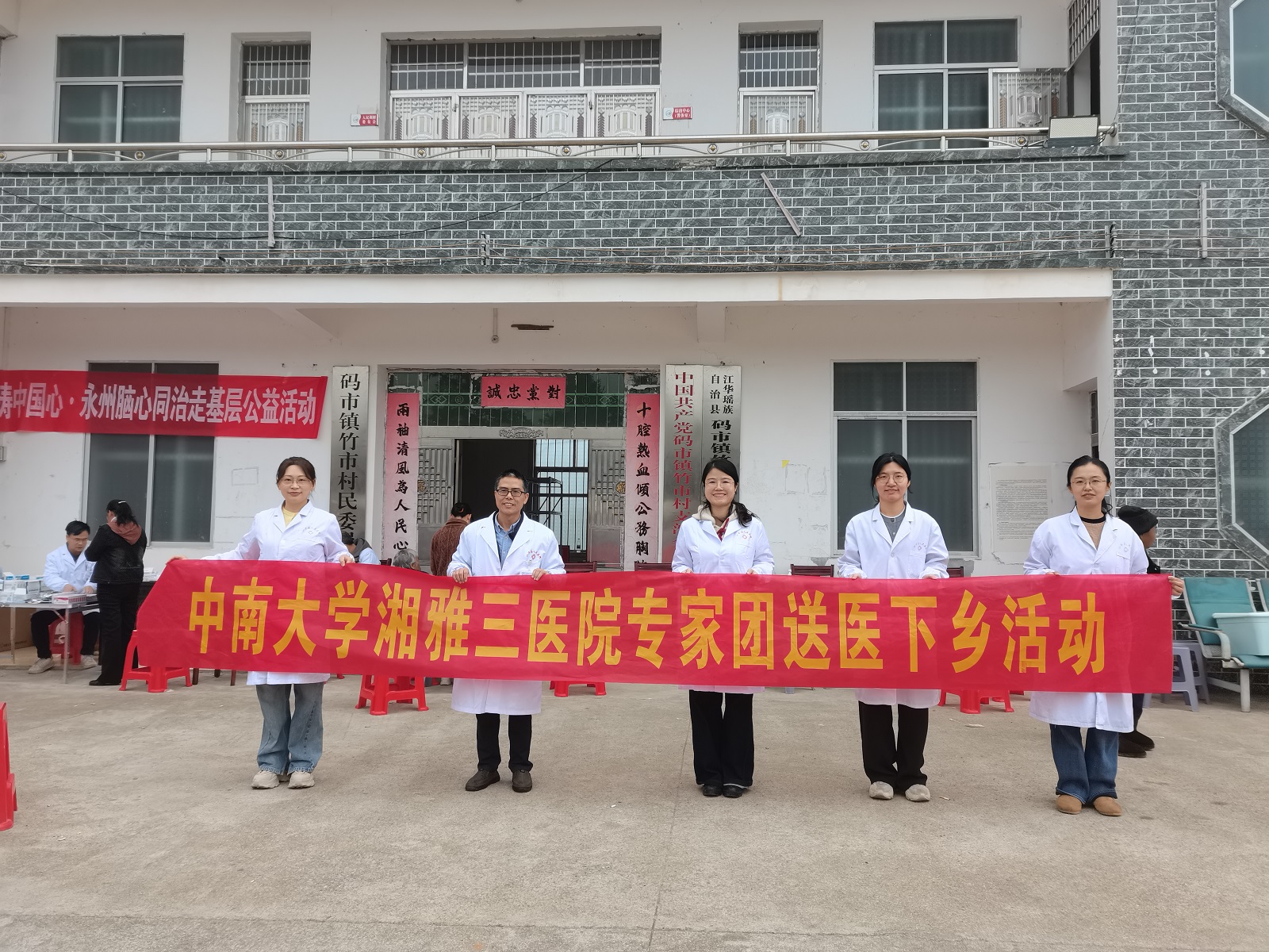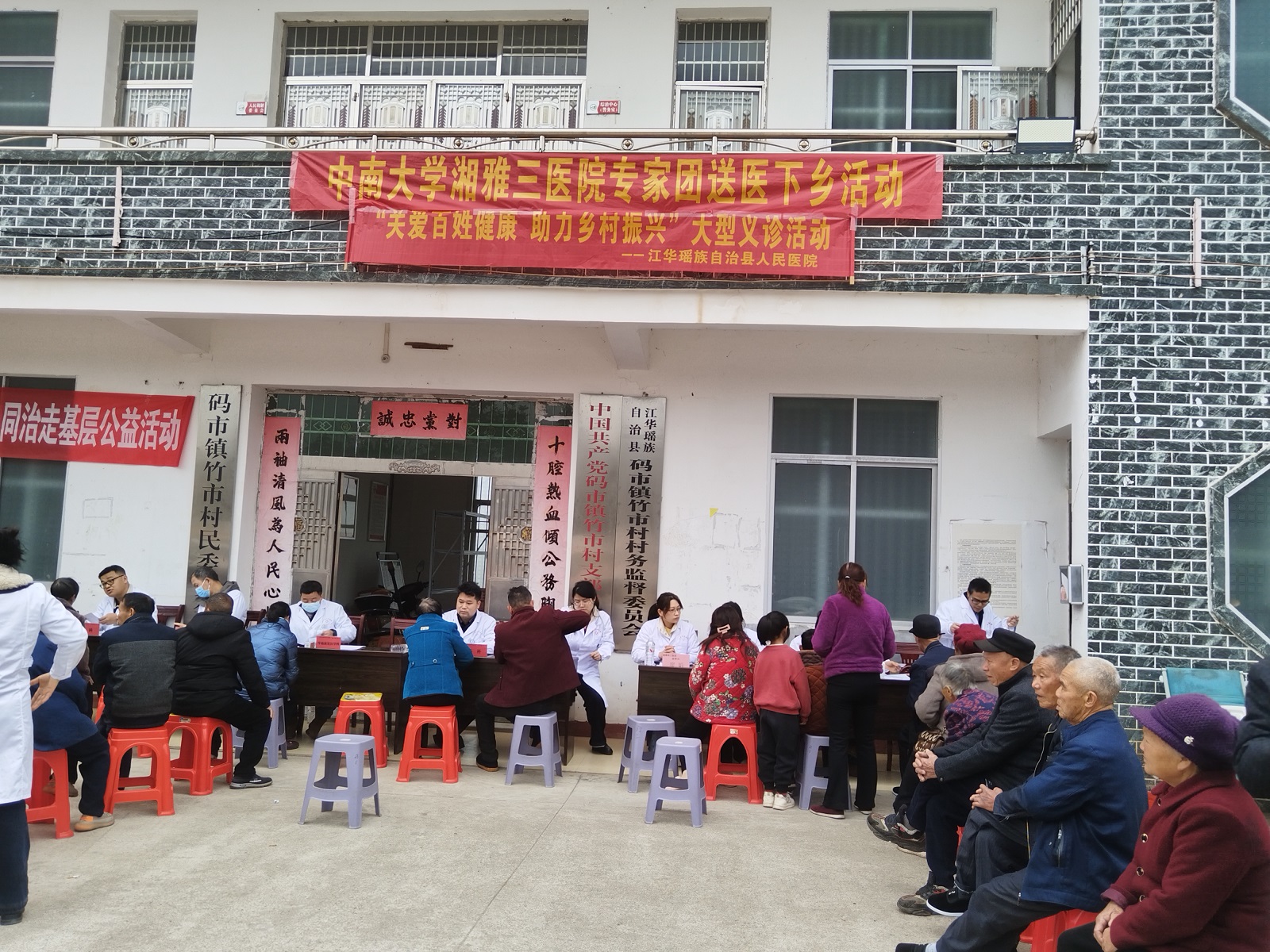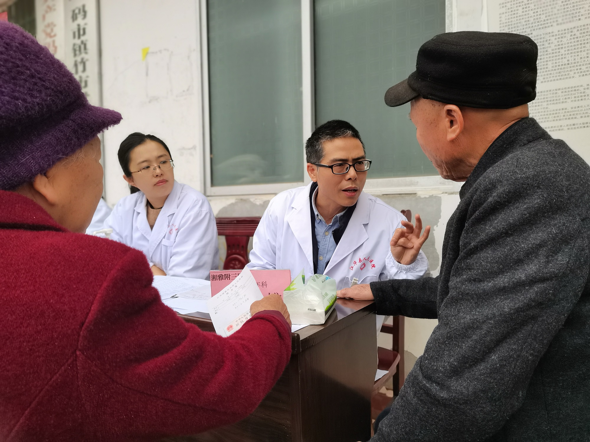 江华瑶乡毗邻广东,农村青壮年多外出务工或经商,留守老人与儿童占比较高。本次义诊团队由中南大学湘雅三医院老年医学科陈志雄、儿科孔敏、妇科杨茜、麻醉科廖娟与龚丽等医生组成,诊疗范围基本覆盖农村基层常见健康需求。