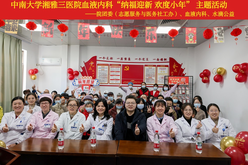 2月11日,正值农历小年,为了贯彻医院“一个中心、两个服务”的宗旨,让病房中的“家人”感受浓厚的年节温暖,由中南大学湘雅三医院血液内科联合医院团委主办,职工第七团支部、医院社志办、血液内科团小组(青年文明号)及水滴公益等公益组织联合承办的“纳福迎新·欢度小年”关爱病友活动在老干楼五楼会议室和病房共同开展。院团委书记、社志办主任程海威,血液内科主任李昕、副主任王二华,血液内科一病区护士长李成媛、二病区护士长阮春红,驻点医务社工,部分医护人员与患者、陪护家属欢聚一堂,共同绘就了一幅医患同心、温情洋溢的迎新画卷。
