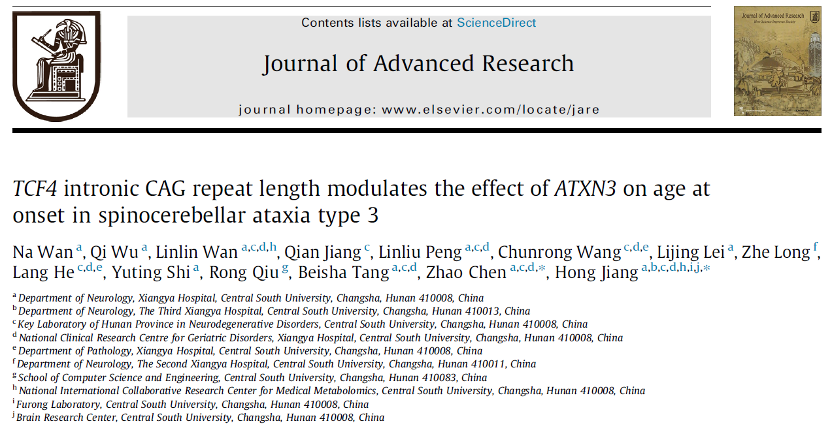 国际罕见病日来临之际,中国科学家在遗传性共济失调研究领域传来重要突破。中南大学湘雅三医院院长、神经内科江泓教授团队联合中南大学湘雅医院科研团队近日在国际权威期刊《Journal of Advanced Research》发表研究论文,首次发现TCF4基因内含子CAG重复长度可显著修饰脊髓小脑性共济失调3型患者的发病年龄,为罕见病的精准预测和诊疗提供了全新视角。