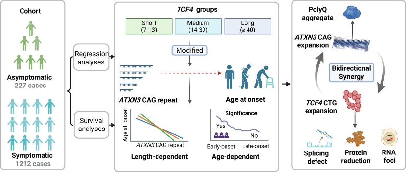 脊髓小脑性共济失调3型(SCA3)是全球最常见的常染色体显性遗传性共济失调,患者主要表现为行走不稳、言语不清、吞咽困难等症状,随病情进展逐渐丧失生活自理能力。该病由ATXN3基因CAG重复序列异常扩增所致,但致病性CAG重复序列的长度仅能解释约50%至70%的发病年龄变异,提示疾病存在着异质性。如何寻找其他影响因素,长期困扰着全球科学家。江泓教授团队基于1439例中国SCA3大规模队列研究,首次发现转录因子4(TCF4)基因内含子区的CAG重复序列可长度依赖性和年龄依赖性地调控ATXN3基因对发病年龄的影响。研究发现,携带长片段TCF4重复的患者,其ATXN3基因每增加一个CAG重复,发病年龄提前约3.18年,而携带短片段的患者仅提前约2.04年。这种修饰效应在早发型患者中最为显著,而在晚发型患者中趋于减弱。通过细胞功能实验,研究团队进一步揭示了TCF4与ataxin-3蛋白之间的双向病理协同作用,为统计学观察到的遗传修饰效应提供了分子生物学基础。