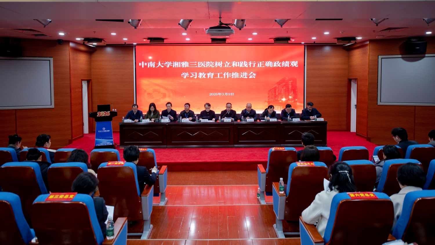 3月9日下午,中南大学湘雅三医院在外科楼二楼学术报告厅召开树立和践行正确政绩观学习教育工作推进会。医院党委副书记、院长江泓主持会议,全体院领导,学习教育工作专班全体成员,党政管理部门党员主要负责人及全体党总支书记、党支部书记参会。