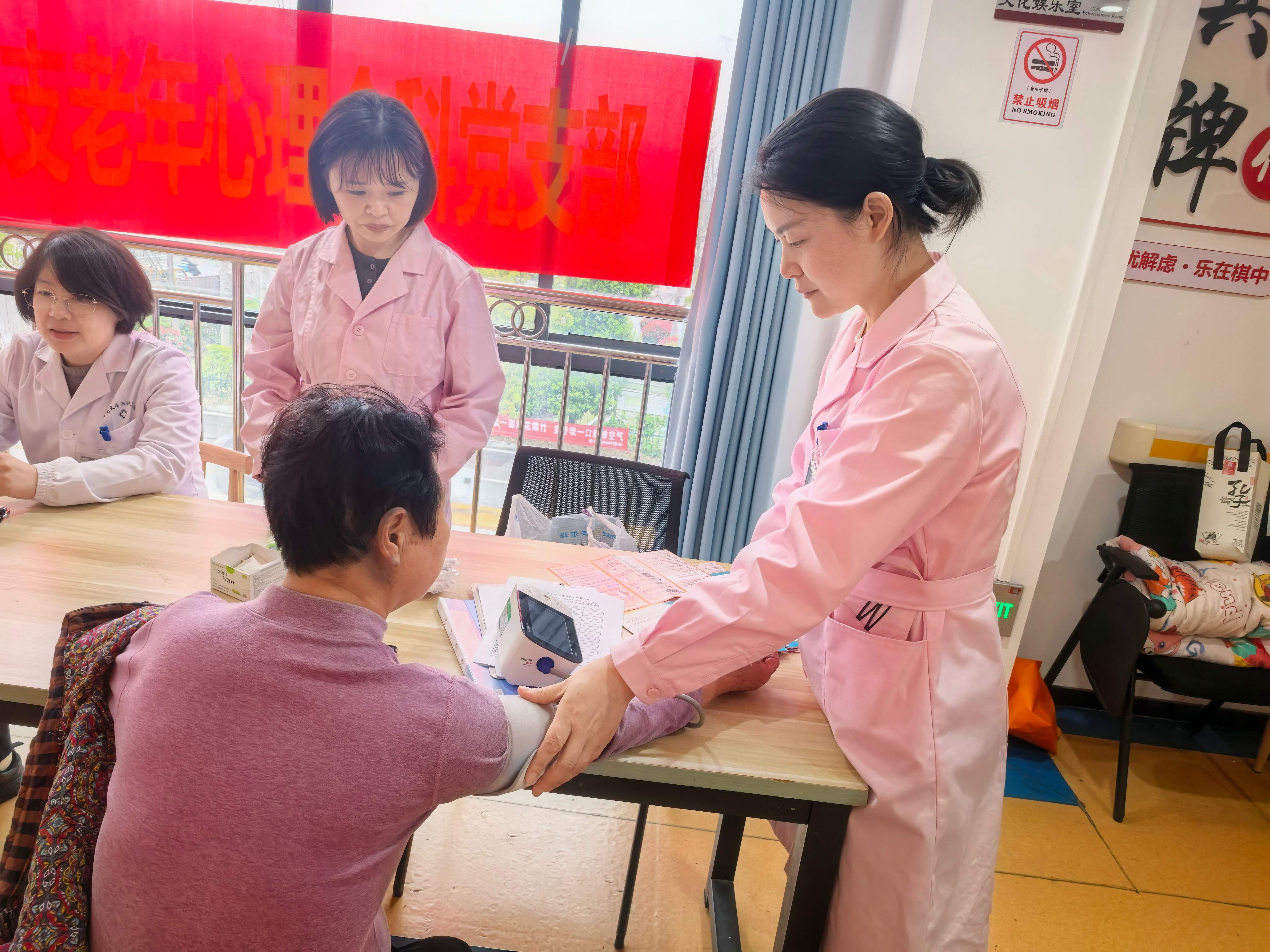 活动现场气氛热烈,前来咨询和问诊的居民络绎不绝。由老年医学科、临床心理科、全科医学科组成的专家团队迅速投入现场问诊。老年医学科副主任谢丽华,代思源医师,临床心理科谭文剑医师耐心细致地为每一位前来咨询的居民听诊检查,针对高血压、糖尿病、慢阻肺、睡眠障碍、焦虑抑郁等常见慢性病、多发病提供专业的诊疗建议和用药指导。针对部分居民存在的心理困扰及睡眠问题,团队提供了贴心的情绪疏导与心理支持,引导社区居民树立“身心同调”的健康理念。