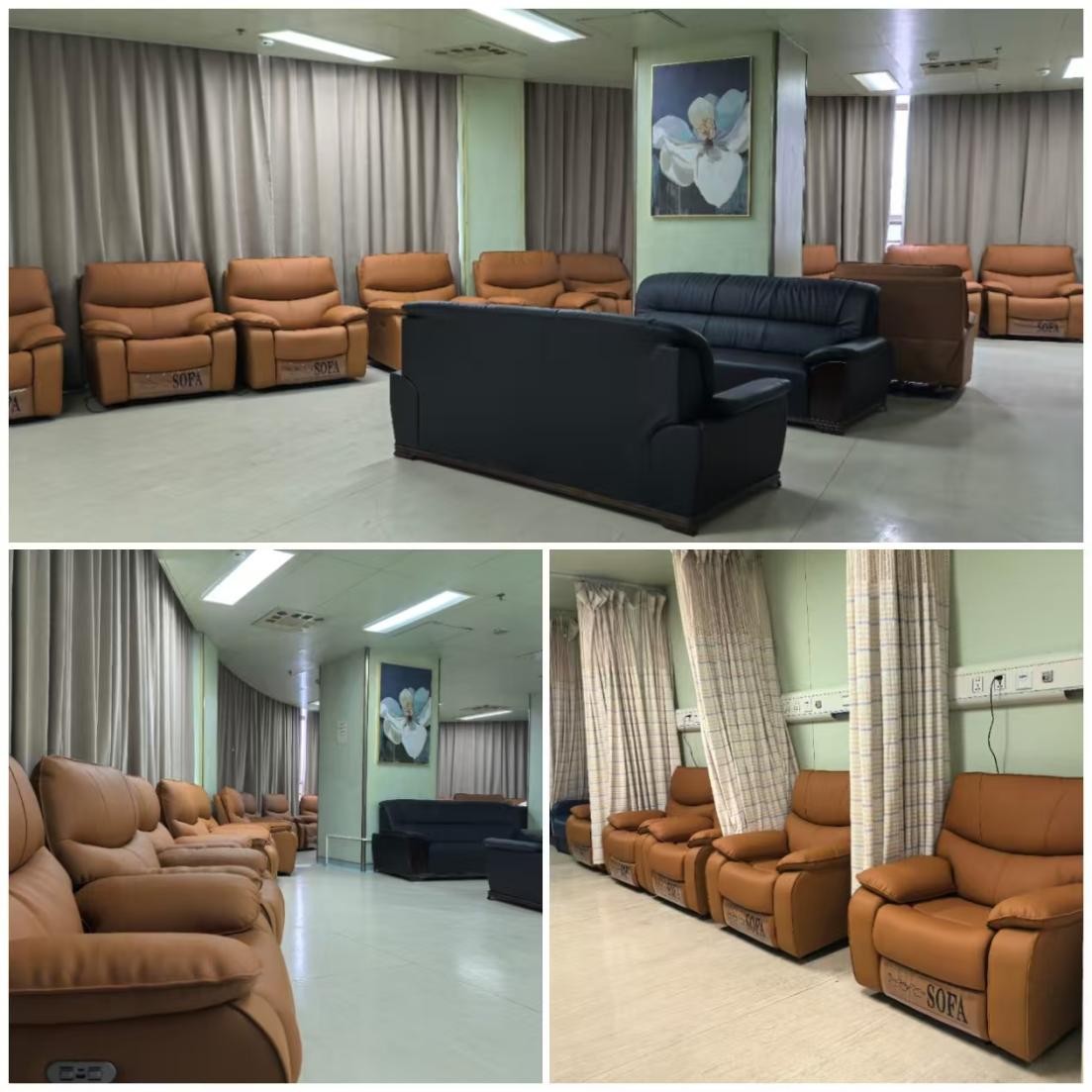 经过近三个月的精心设计与施工,手术中心的“三室二厅”——医生休息室、麻醉师休息室、护士休息室、就餐区、更衣区,以焕然一新的面貌亮相。墙面和沙发采用柔和的米白、浅蓝色调,搭配局部亮色点缀,米色避光窗帘营造出宁静放松的氛围。休息区更换了人体工学的舒适沙发、躺椅,配备柔软靠垫和毛毯,还提供了相对私密的小憩角落。就餐区升级了餐桌椅,满足快速用餐和简短会议需求;充足电源插座和高速Wi-Fi覆盖,方便医护人员利用碎片时间处理工作。更衣室优化了储物空间,更新设施,提供更好的隐私保护。饮水机、微波炉等设备也焕然一新,随时补充水分和能量。