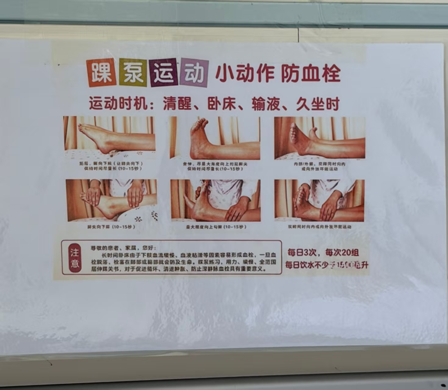 护士们在病房张贴了清晰的踝泵运动宣教海报,用图文并茂的方式,详细标注勾脚、绷脚、内外翻、环转等动作要领,以及每日3次、每次20组的练习频次,患者清醒、卧床、输液或久坐时均可进行。同时,护士们开展一对一床边指导,手把手示范动作要点,协助卧床患者完成被动训练,指导能活动的患者主动练习,确保人人掌握规范动作,让康复训练不打折扣。