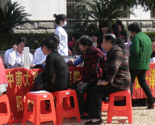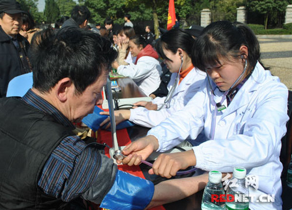 湘雅三医院健康咨询台前人头攒动,研究生们热情地为前来咨询的老百姓测量血压、血糖,并提供基本健康咨询,他们严谨的测量和真诚的微笑赢得了在场群众的高度赞扬。
