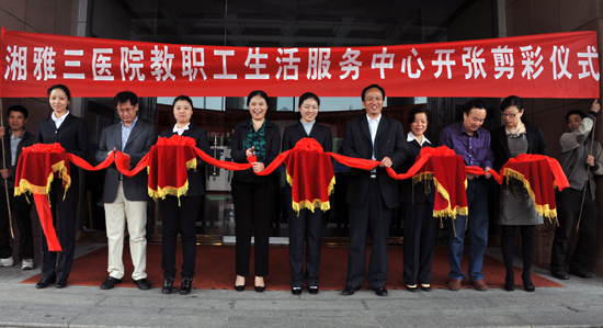 4月11日上午9时38分,湘雅三医院综合楼前人声鼎沸,热闹非凡,院工会教职工生活服务中心在阵阵鞭炮声中开业了,院党委书记罗爱静、党委副书记兼纪委书记吴希林、副院长郑治、党委副书记兼工会主席邓云龙出席仪式并剪彩,剪彩仪式由邓云龙主持。