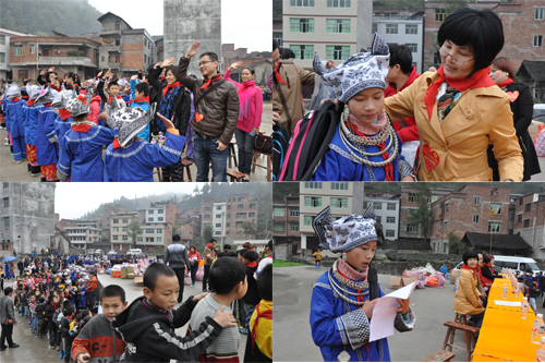 当日上午,小木莲、小志军、小金梅等其他数百名孩子,穿上苗服,排成整整齐齐的队伍,早早地在学校操场等待“直通车”的到来。9时许,满载30余箱物品的“直通车”终于驶进了学校的操场,之前窸窸窣窣的人群顿时安静下来,只剩下一个个期待的眼神。