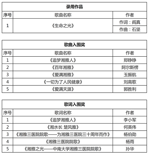 为加强医院文化建设,打造医院文化品牌,塑造医院形象,弘扬医院精神,增强医院凝聚力,有力推进医院各项事业发展,中南大学湘雅三医院于7月16日向全院及社会各界公开征集院歌。截至9月1日,收到来自省内外共160个作品(歌词与歌曲有重复),其中歌词78个,歌曲82个。在此,对所有参加本次征集活动的投稿者、创作者表示衷心的感谢!