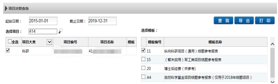 第二步:选择正确项目和项目起止时间,勾选模板11,点击查询。(决算数截止日期为2019年12月31日。)