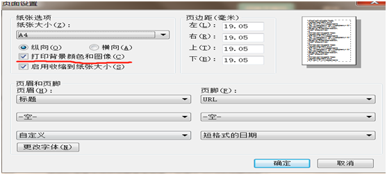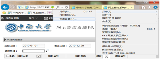 第三步:设置打印显示,打印带有“中南大学”水印的《纵向科研项目(通用)结题参考报表》。在浏览器的设置—打印—页面设置—勾选打印背景颜色和图像。