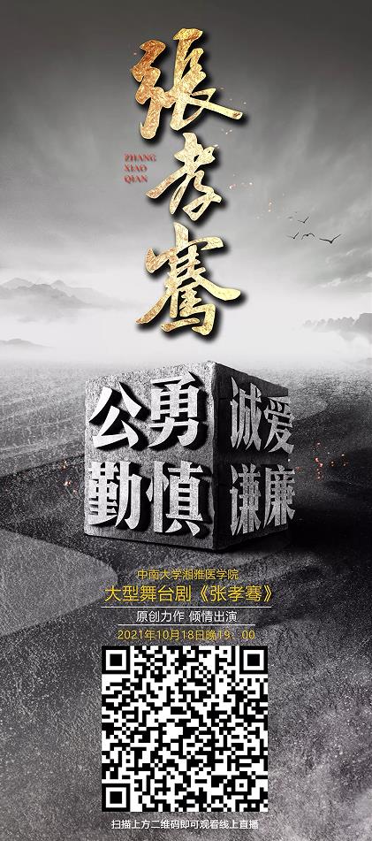 为庆祝中国共产党成立 100 周年,致敬 100 年前湘雅首届毕业生,中南大学湘雅医学院师生原创力作,倾情出演,兹定于 2021 年 10 月 18 日晚 19 点在湘雅医学院新校区体育馆举办大型舞台剧 《张孝骞》首映庆典。