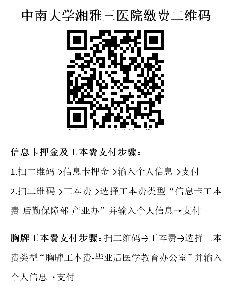 (1)已登记住宿需求的新生报到期间可办理入住手续,住宿费按年度缴费。医院住院医师宿舍位于中南大学湘雅三医院科教大楼(长沙市岳麓区桐梓坡路与双塘路交叉口东150米),新生自备日常生活用品和床上用品。