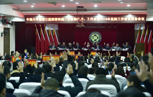 2月26日,湘雅三医院召开四届二次职代会、工代会暨2016年医院工作会议。会议号召全体干部职工深入贯彻落实党的十八大,十八届三中、四中、五中全会精神及习近平总书记系列重要讲话精神,以“四个全面”战略及“五大发展理念”为引领,以提高技术、服务、效率为核心,改革创新,务实发展,谱写医院“十三五”开局精彩篇章,为实现“医院发展、人民满意、职工幸福”的“三院梦”再立新功!